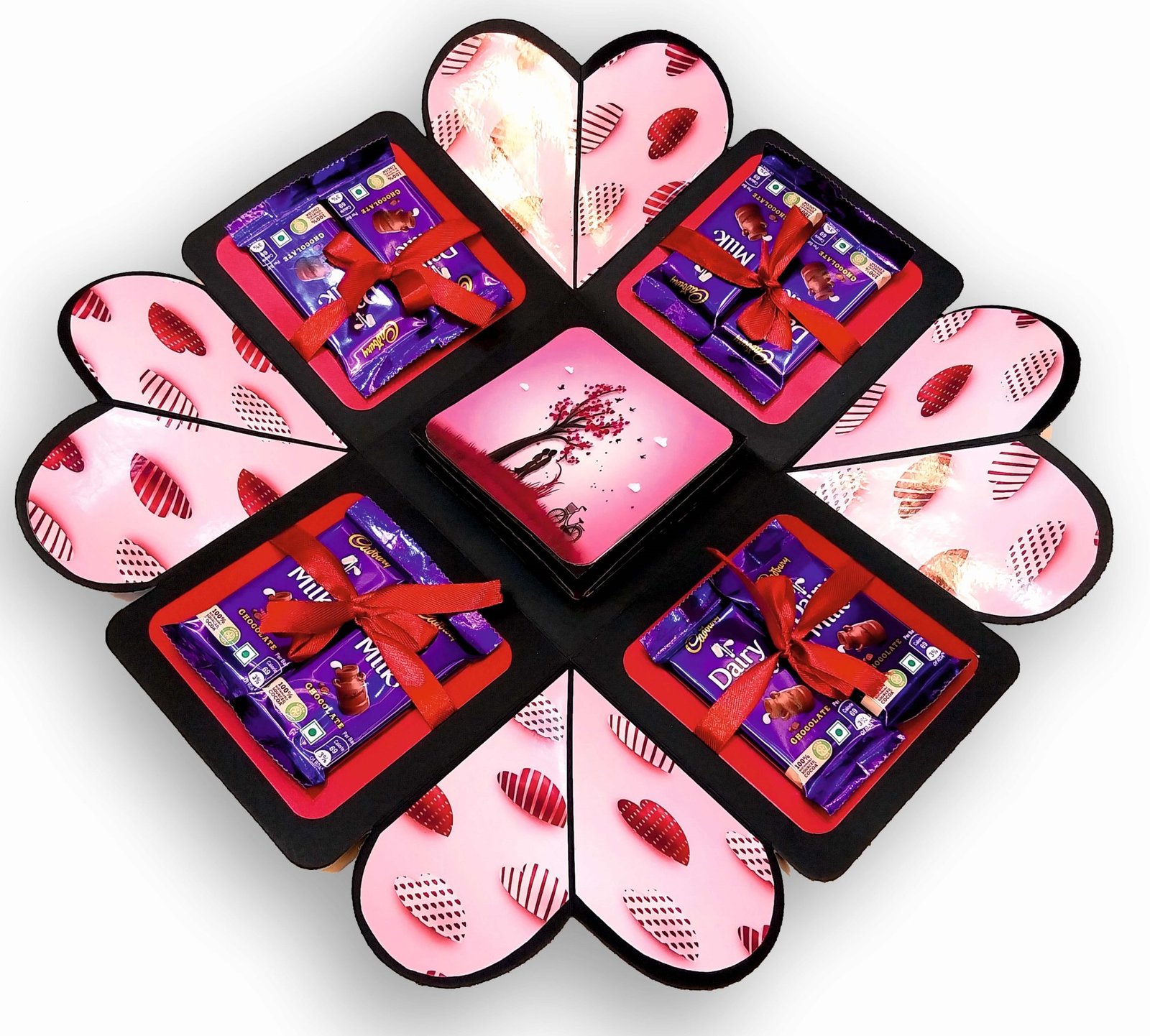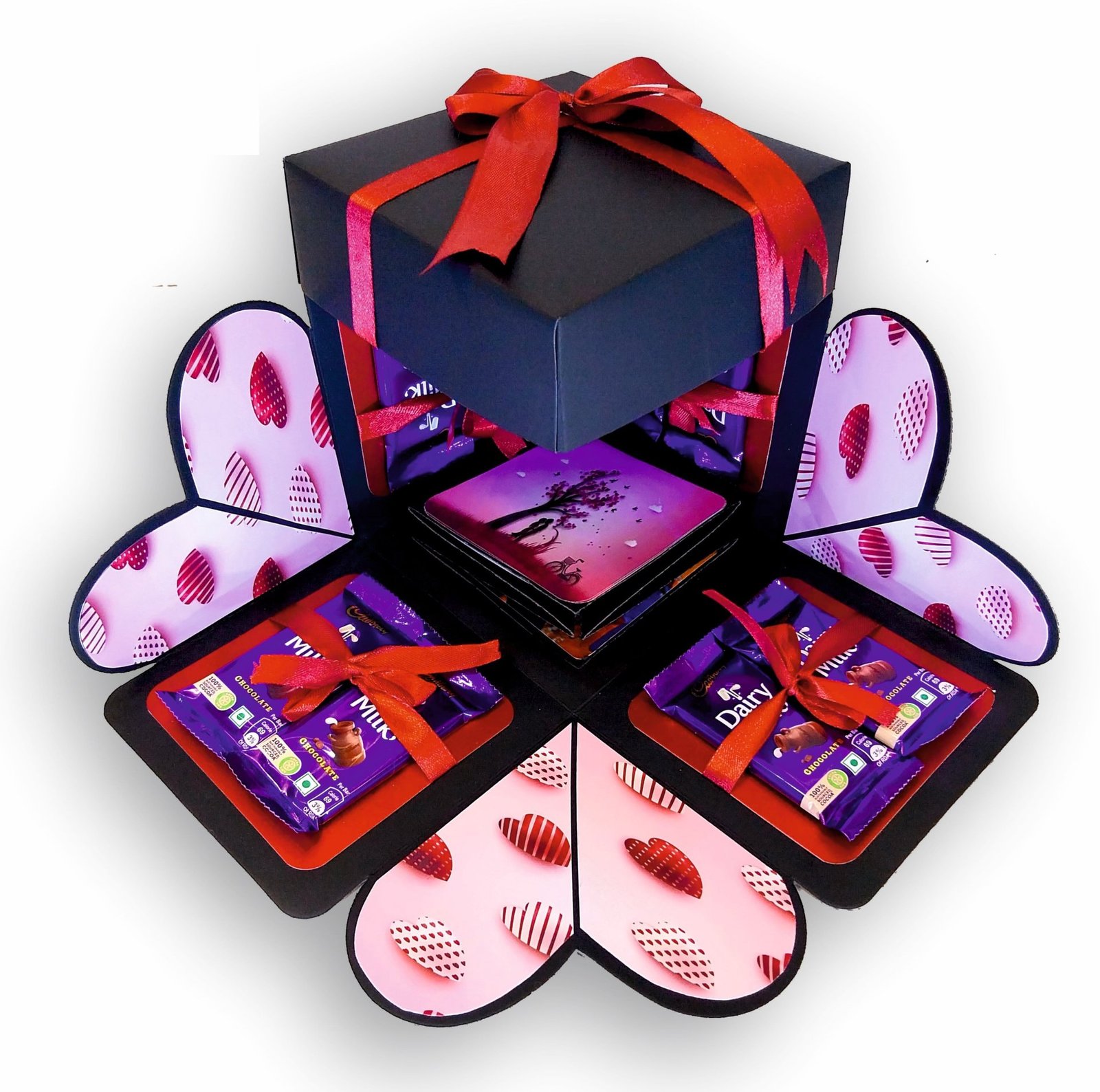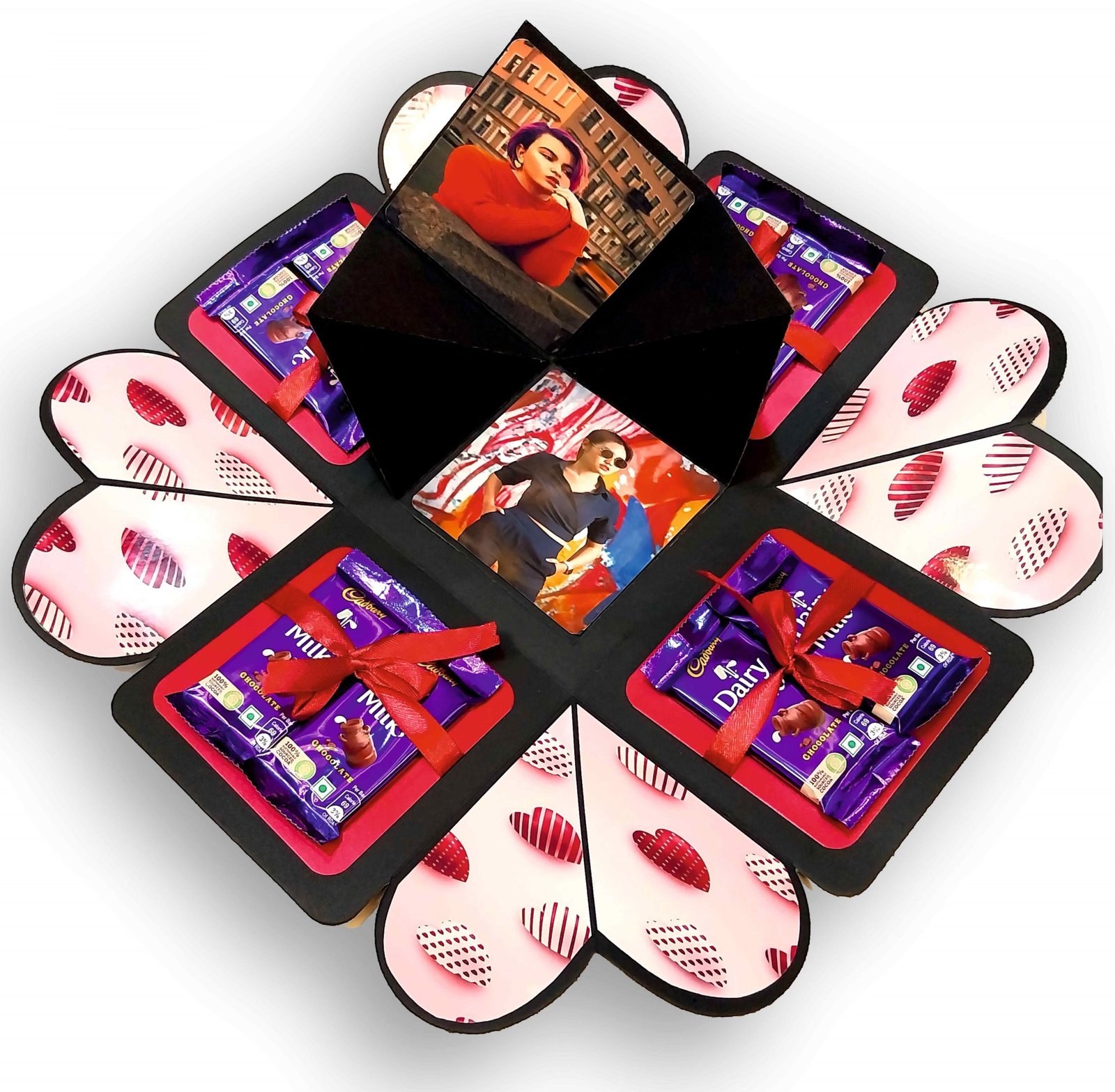 Our explosive boxes are innovative and extremely popular for gifting on special occasions. It is ideal as a Wedding gift, Wedding Anniversary Gift or Valentine Love Gift for your wife / husband, fiancé, boyfriend or girlfriend as you can customize it with your own photos, Chocolate and messages, making it a very handmade gift. When closed, the box looks like a gift box measuring 5" by 5" by 5" decorated beautifully with a border of handmade roses by black ribbon on the lid and a gorgeous bow and use 400 GSM paper, When open, all the sides fall back to reveal a large three-layered card filled with flaps, pull-out message tags and photo spaces. There are totally 2 spaces where personal photos or messages can be added. Some Photo dimensions should be approximately 4 inches by 4 inches, 3.5 inches by 3.5 inches and 3 inches by 3 inches . Four romantic and loving quotes complimenting the colour scheme adorn the four corners of the box. You can also slip in a gift card, or cash gift in the central gift box. Dimensions of the gift box when closed are 5 inches by 5 inches by 5 inches. When open, the two-layered explosion box card measures 15 inches by 15 inches. Central gift compartment measures 2.5 inches by 2.5 inches by 2.5 inches. Available in 2 colour combinations. As all items are handmade,