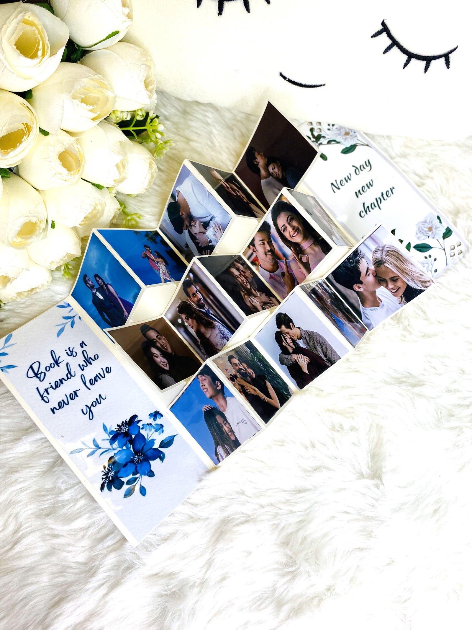 - Surprise your loved one with a Personalised Photo Pop-Up Greeting Card that combines creativity, thoughtfulness, and sentiment in one beautiful package. Featuring a unique pop-up design, this card brings your heartfelt message to life with a delightful 3D effect that adds a special touch to your gift. What sets this card apart is the option to personalise it with your favorite photo, making it a truly one-of-a-kind keepsake. Whether it’s a cherished memory, a funny moment, or a romantic snapshot, this custom element ensures your card is as unique as your relationship. Crafted with premium materials and meticulous attention to detail, this greeting card is designed to impress and last as a token of your love. Perfect for Valentine’s Day, anniversaries, birthdays, or just because, it’s a versatile way to show your appreciation and make your loved one feel extra special. Give the gift of love, creativity, and unforgettable memories with this personalised pop-up greeting card—a heartfelt keepsake that will be treasured forever. Express your love in a uniquely personal way with this beautifully crafted accordion-style greeting card. The elegant design features a romantic red and white colour scheme with delicate heart patterns and cascading rose details. This special card includes space for two cherished photographs, making it perfect for displaying treasured moments together. The centrepiece showcases a heartfelt message in striking red text, adorned with scattered heart motifs and a gorgeous rose border. The card's fold-out design creates an eye-catching display piece that stands beautifully on any surface. Ideal for Birthday / Anniversary occasion when you want to make your loved one feel extra special. The thoughtful combination of personalised photos and romantic sentiment makes this card a keepsake that will be treasured for years to come.