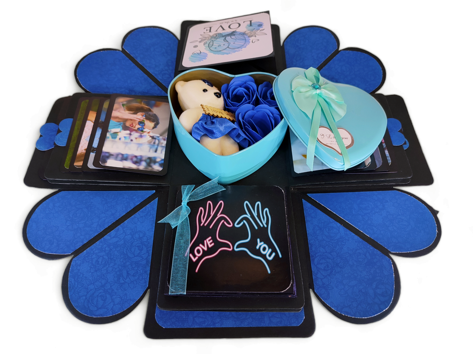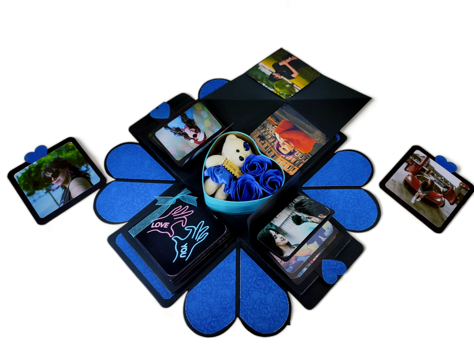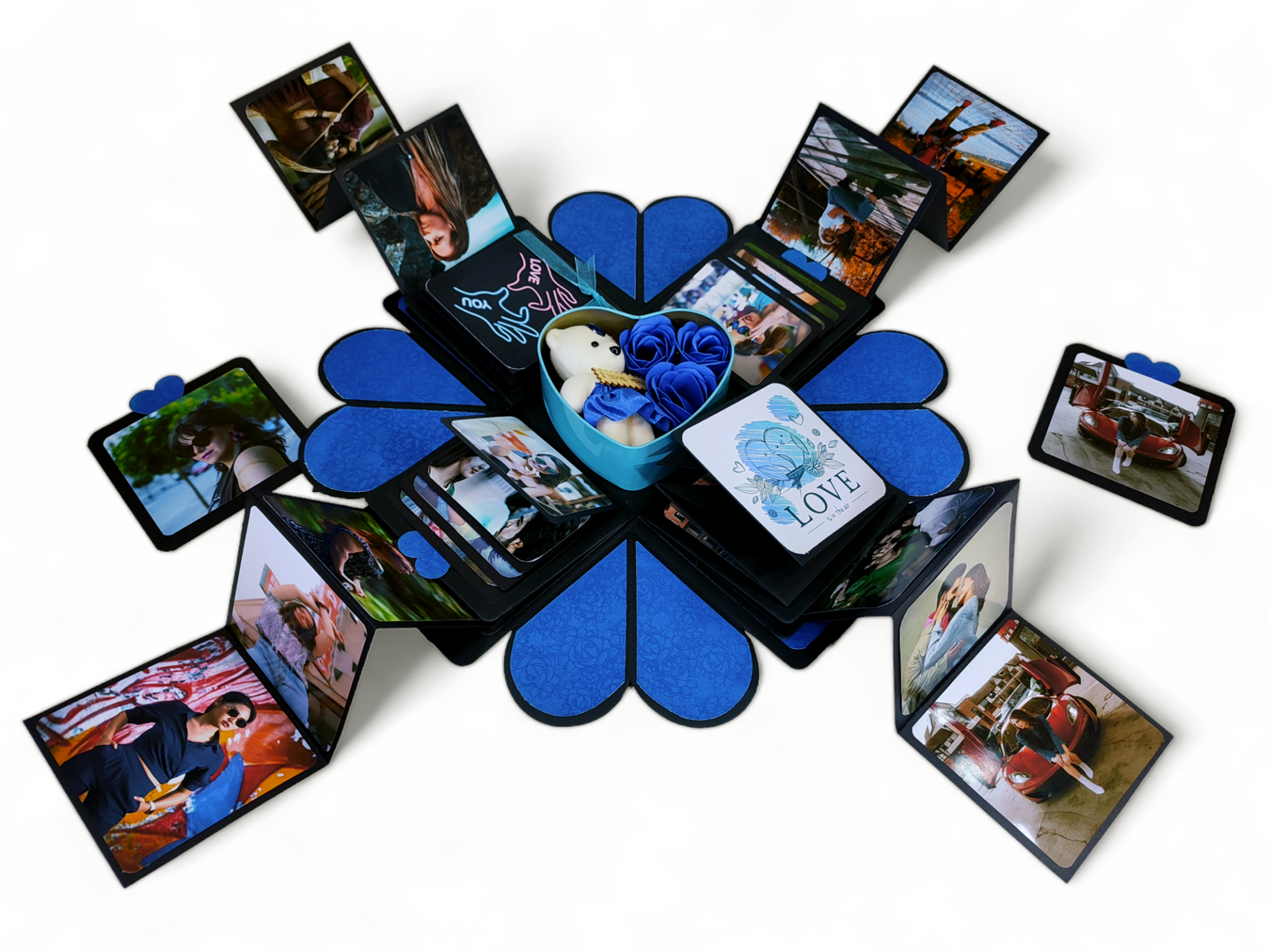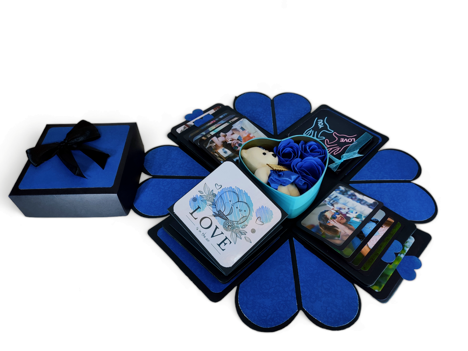 Our explosive boxes are innovative and extremely popular for gifting on special occasions. It is ideal as a Wedding gift, Wedding Anniversary Gift or Valentine Love Gift for your wife / husband, fiancé, boyfriend or girlfriend as you can customize it with your own photos, Chocolate and messages, making it a very handmade gift. When closed, the box looks like a gift box measuring 5" by 5" by 5" decorated beautifully with a border of handmade roses by black ribbon on the lid and a gorgeous bow and use 400 GSM paper, When open, all the sides fall back to reveal a large three-layered card filled with flaps, pull-out message tags and photo spaces. There are totally 26 spaces where personal photos or messages can be added. Some Photo dimensions should be approximately 4 inches by 4 inches, 3.5 inches by 3.5 inches and 3 inches by 3 inches . Four romantic and loving quotes complimenting the colour scheme adorn the four corners of the box. You can also slip in a gift card, or cash gift in the central gift box. Dimensions of the gift box when closed are 5 inches by 5 inches by 5 inches. When open, the two-layered explosion box card measures 15 inches by 15 inches. Central gift compartment measures 2.5 inches by 2.5 inches by 2.5 inches. Available in 2 colour combinations. As all items are handmade,