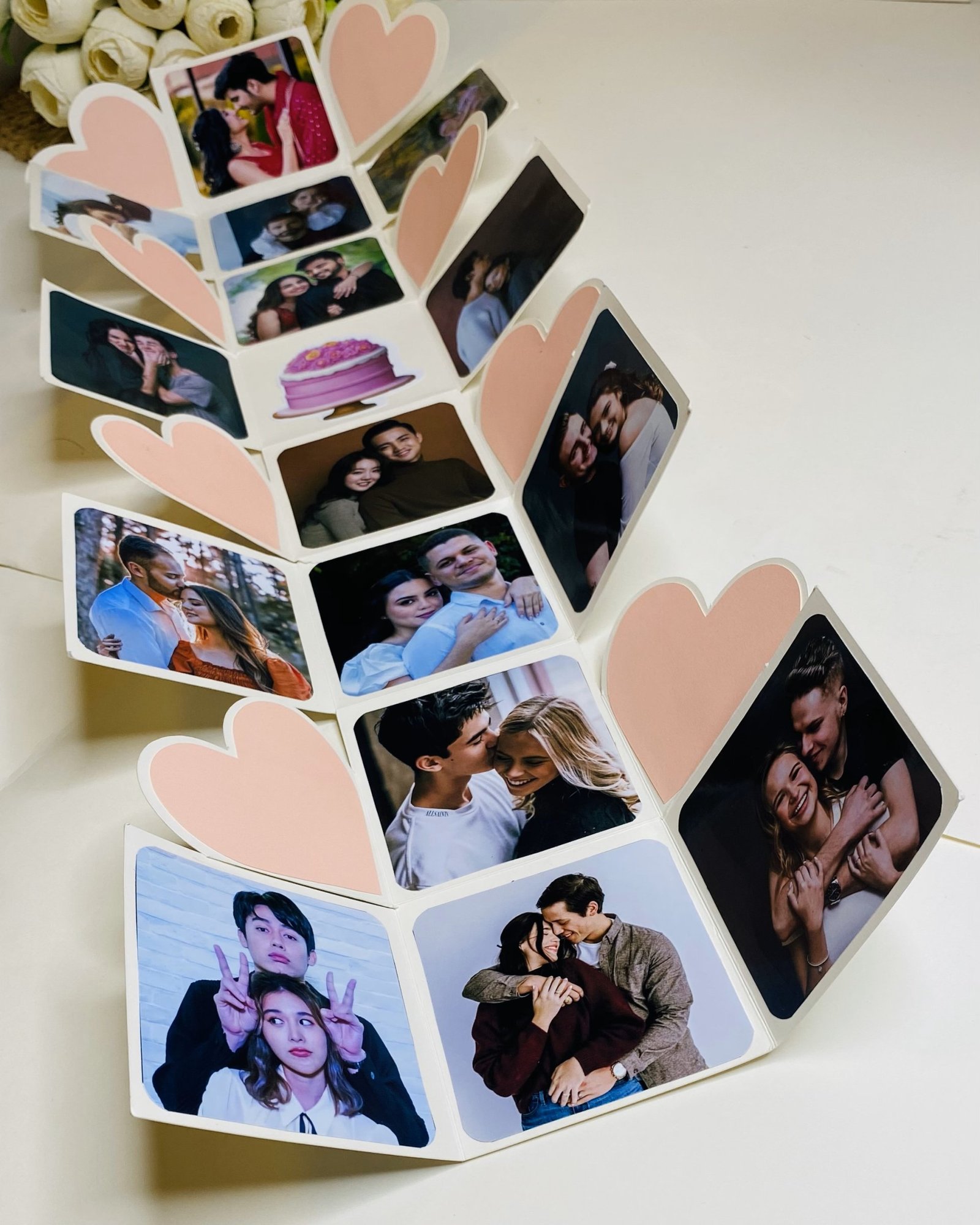 Our explosive boxes are innovative and extremely popular for gifting on special occasions. It is ideal as a Wedding gift, Wedding Anniversary Gift or Valentine Love Gift for your wife / husband, fiancé, boyfriend or girlfriend as you can customize it with your own photos and messages, making it a very handmade gift. When closed, the box looks like a gift box measuring 4" by 4" by 4" decorated beautifully with a border of handmade roses by black ribbon on the lid and a gorgeous bow and use 300 GSM paper, When open, all the sides fall back to reveal a large Four-layered card filled with flaps, pull-out message tags and photo spaces. There are totally 16 spaces where personal photos or messages can be added. Some Photo dimensions should be approximately 3.3 inches by 3.3 inches, Or 8.5X8.5 CM. Four romantic and loving quotes complimenting the colour scheme adorn the four corners of the box. You can also slip in a gift card, or cash gift in the central gift box. Dimensions of the gift box when closed are 4 inches by 4 inches by 4 inches. When open, the Four-layered explosion box card measures 12 inches by 30 inches. Central gift compartment measures 2.5 inches by 2.5 inches by 2.5 inches. Available in 2 colour combinations. As all items are handmade,